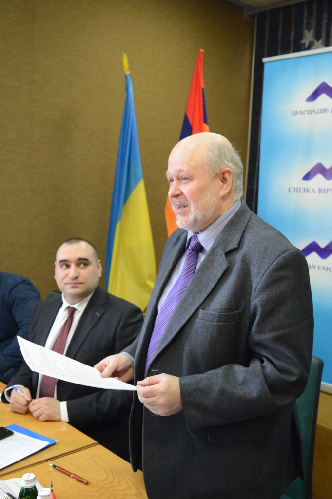 Давид Мкртчян зачитав присутнім вітальне слово від голови Спілки вірмен України Вілена Шатворяна, а також розповів про історію акції «Подаруй книгу» та її основну мету – створити в провідних бібліотеках України фонди вірменської літератури.