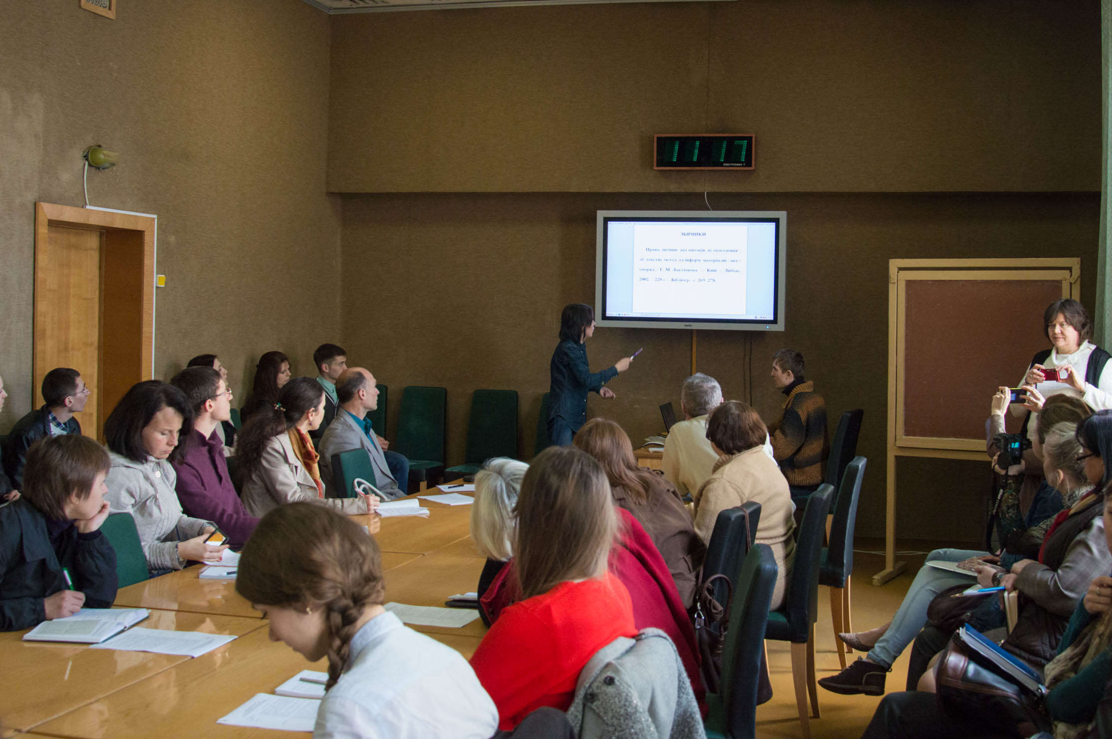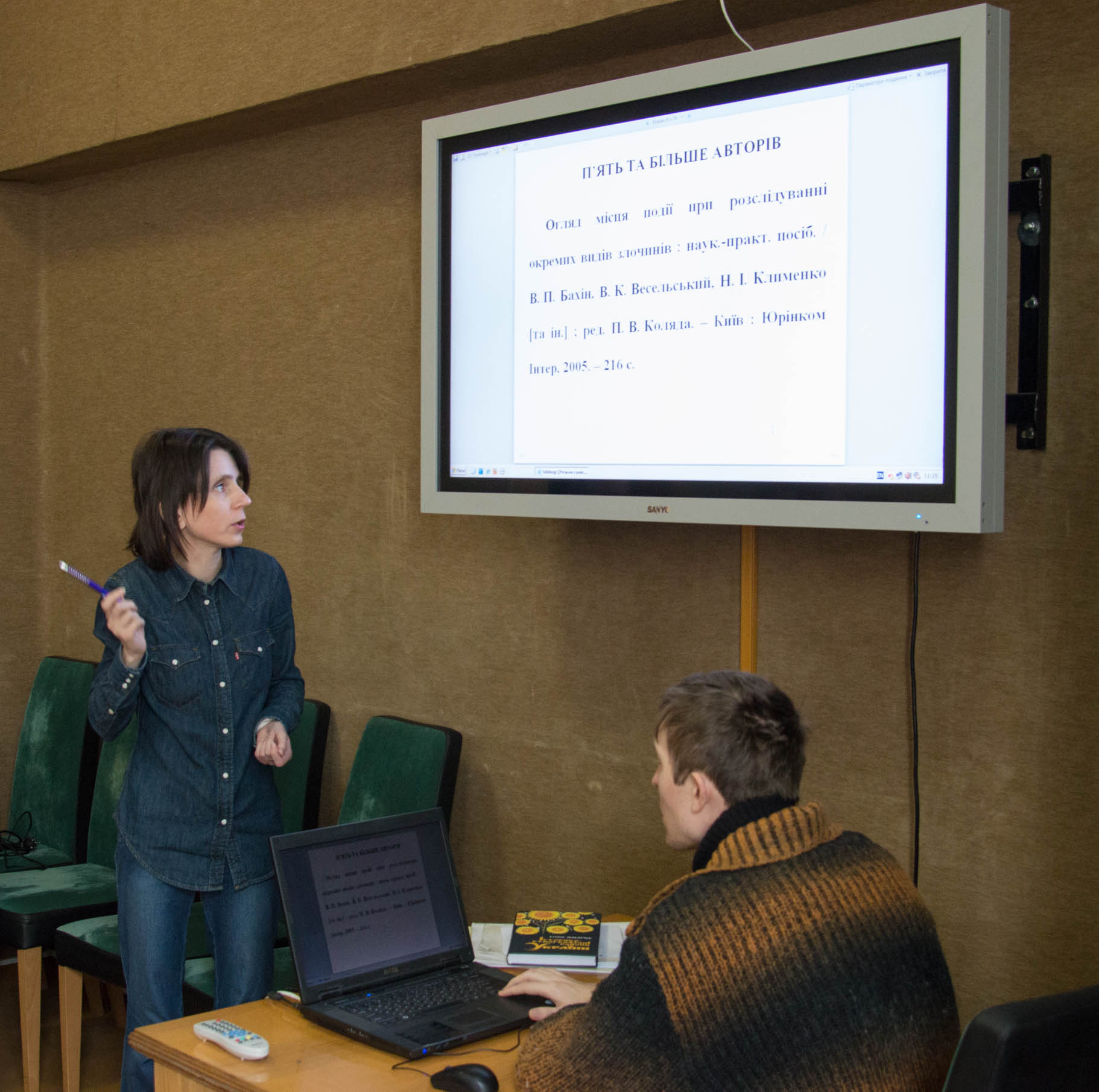У другій частині семінару молодший науковий співробітник відділу довідково-бібліографічного обслуговування НБУВ Аліна Колесніченко надала методичні рекомендації щодо укладання бібліографічного опису джерел дослідження та оформлення бібліографічних посилань у тексті дисертаційної роботи. Провідний бібліограф відділу довідково-бібліографічного обслуговування НБУВ Андрій Жабін поінформував про умови використання баз даних наукової інформації, доступ до яких надає НБУВ.