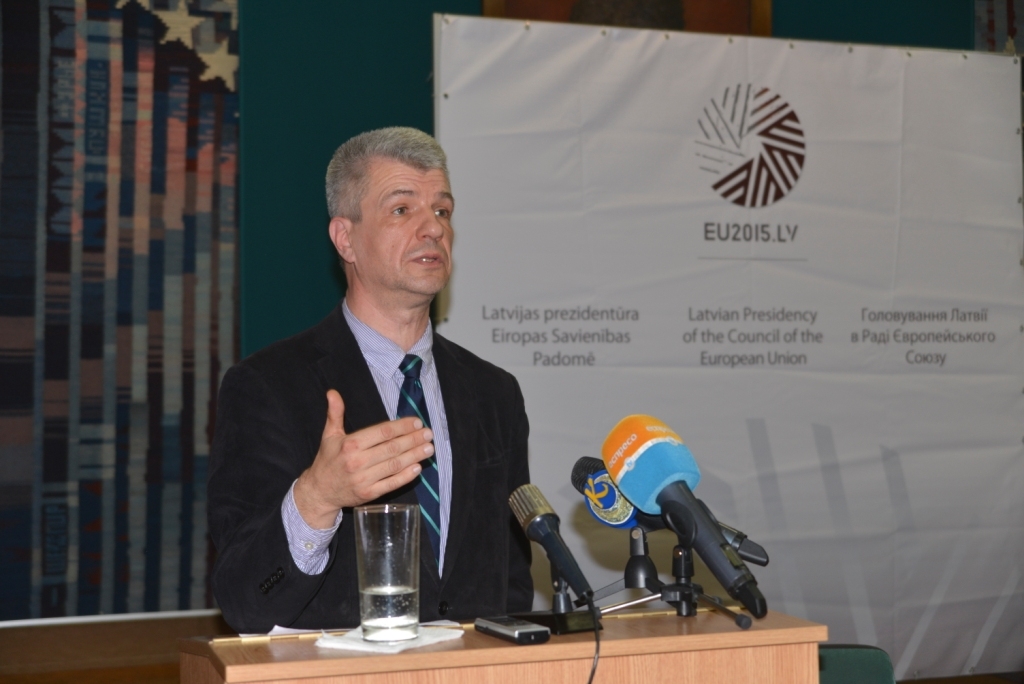 «Ми дуже багато знаємо про великі держави, але мало знаємо про своїх сусідів. У результаті – не можемо допомогти один одному», – такими словами розпочав свою лекцію відомий латвійський історик, асоційований професор історичного та філософського факультетів Латвійського Університету д-р Ерікс Єкабсонс. Аналізуючи основні події, пов’язані із боротьбою латвійського та українського народів за свою незалежність, історик виокремив спільні ключові моменти щодо генезису ідеї державності, анексії територій, репресій, участі у військових з’єднаннях тощо. Водночас Ерікс Єкабсонс наголосив на необхідності більш глибокого дослідження історії Латвії та України в ХХ ст. «Багатьох подій, які важливі для взаєморозуміння, немає в підручниках історії. Хоча саме вони підтверджують факт становлення наших народів як націй і є позитивними спогадами в пам’яті наших народів», – підкреслив професор Латвійського університету.