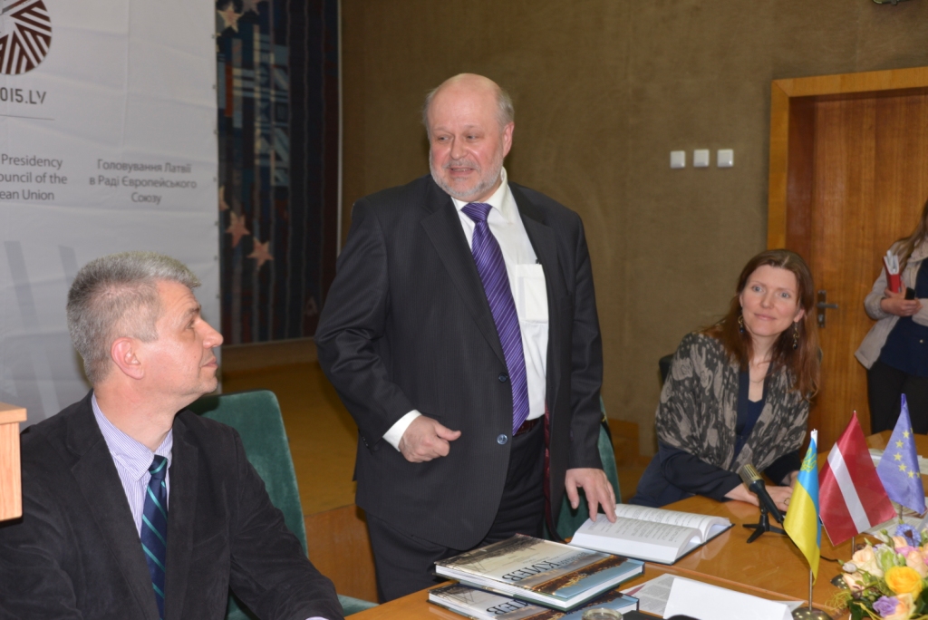 Вітаючи гостей заходу генеральний директор НБУВ, член-кореспондент НАН України Володимир Попик підкреслив, що зустрічі, які відбуваються в рамках публічної дипломатії, активізують ділові й творчі відносини між науковими і культурними закладами різних країн, а в контексті бібліотечної діяльності – сприяють розвитку контактів із національними бібліотеками світу, реалізації нових цікавих проектів міжбібліотечної взаємодії. «Посольство Латвії проводить багато заходів, спрямованих на ознайомлення українців із досягненнями і досвідом Латвії щодо входження в ЄС, здійснення соціальних і економічних реформ, значних культурних перетворень. Для всіх нас ознайомлення з цим досвідом матиме величезне значення», – зауважив Володимир Попик.