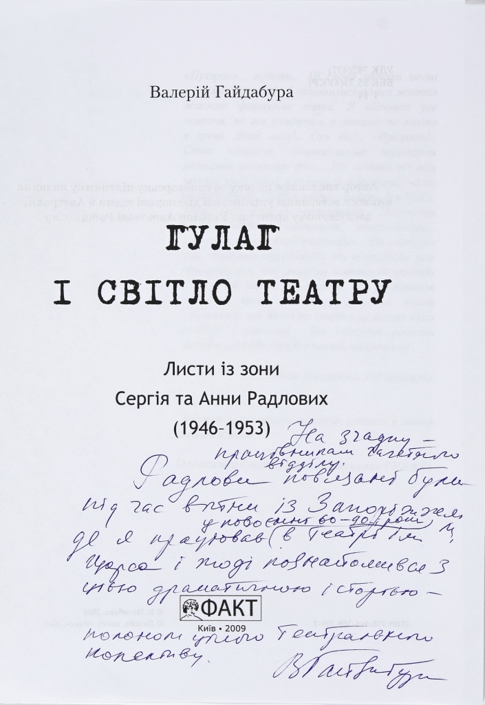 ГУЛАГ і світло театру. Листи із зони Сергія та Анни Радлових (1946–1953). – Київ, 2009. Книга видана за спонсорської допомоги ветерана української діаспорної сцени в Австралії, заслуженого артиста України Антона Рибницького. У книзі використано надзвичайно багато джерел, також є вкладки з фотографіями, у тому числі й архівними, покажчик імен. Дарунок супроводжується дарчим написом: «На згадку працівникам газетного відділу. Радлови пов’язані були під час війни із Запоріжжям, де я працював у повоєнні 60-90-і роки в театрі ім. Щорса і тоді познайомився з цією драматичною історією – полоном цього театрального колективу».