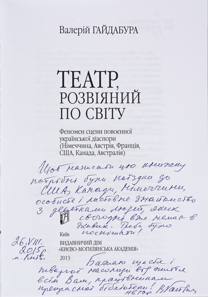 Театр, розвіяний по світу. Феномен сцени повоєнної української діаспори (Німеччина, Австрія, Франція, США, Канада, Австралія). – Київ, 2013. У дарчому написі відомий театральний діяч зазначив: «Щоб написати цю книжку потрібні були поїздки до США, Канади, Німеччини, особисте і листовне знайомство з десятками людей, яких сьогодні вже немає в живих». До цієї теми автор звернувся першим в українському театрознавстві. Книга написана в науково-популярному стилі, особливу увагу дослідник звертає на листування окремих діячів українського театру діаспори. У книжці надзвичайно багато фотодокументів. Також подано іменний покажчик та репертуари основних театрів діаспори.