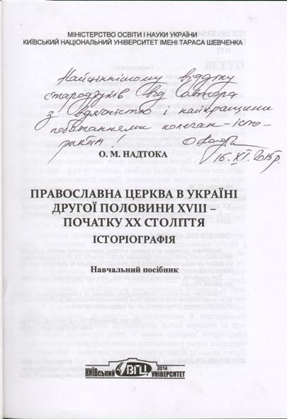 Надтока О. М. Православна церква в Україні другої половини ХVIII – початку ХХ століття: історіографія : навч. посіб. / О. М. Надтока. – Київ : Видавничо-поліграфічний центр «Київський університет», 2014. – 255 с.: іл.