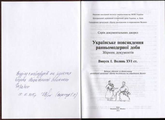 Українське повсякдення ранньомодерної доби: Збірник документів. – Вип.1: Волинь XVI ст. / НДІ українознавства МОН України, ЦДІА України, м. Київ, ГО «Центр досліджень та відродження Волині»; Упорядн. В. В. Безпалько та ін. – Київ: Фенікс, 2014. – 776 с., іл.