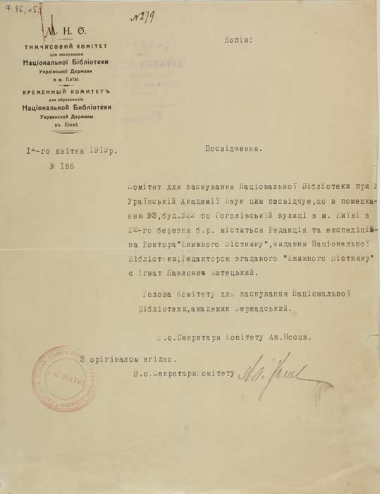 Один з фундаторів Національної бібліотеки Української держави у 1918 р. (з 1920 р. – Всенародна бібліотека України, нині – НБУВ), в якій у 1922–1929 рр. завідував відділом рукописів.