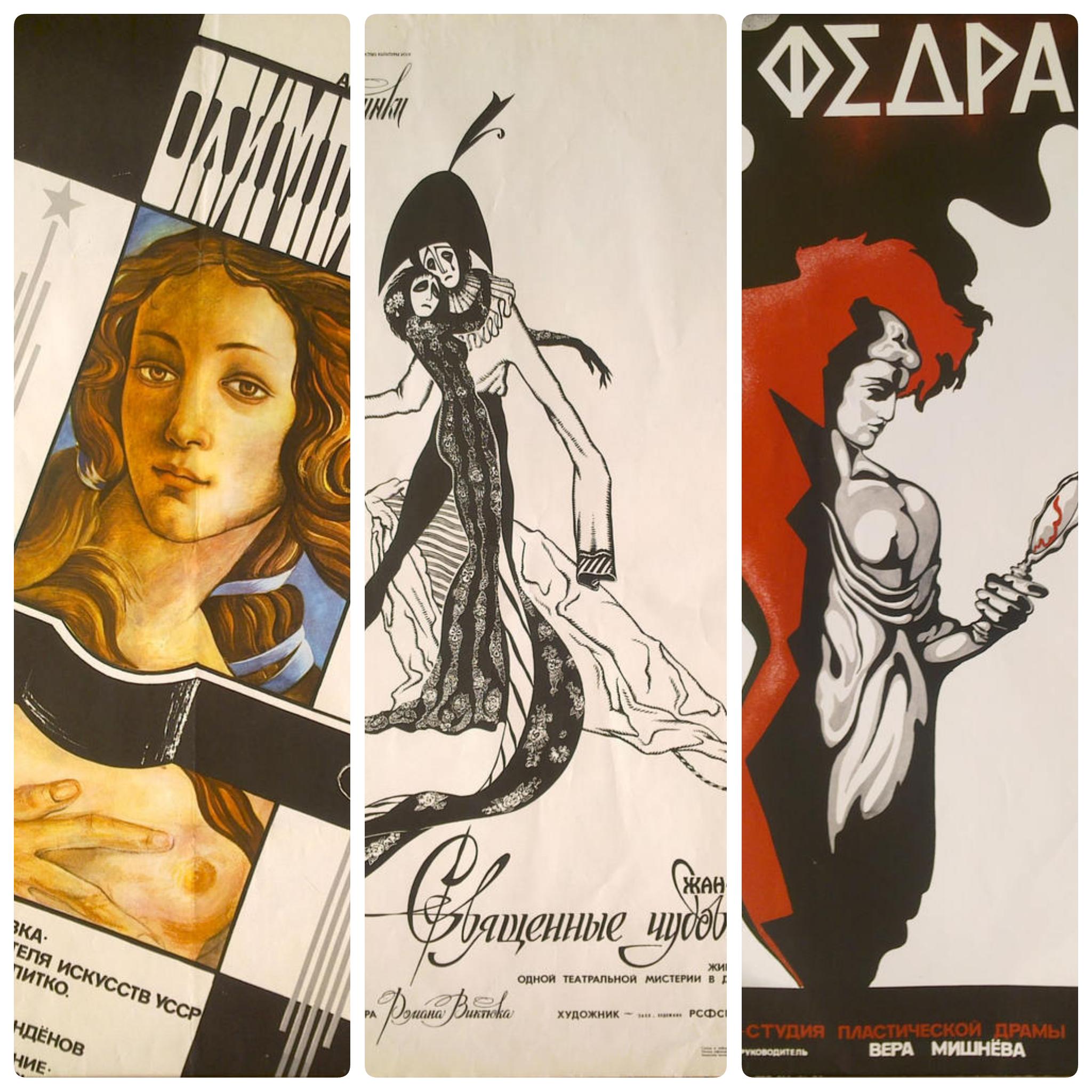 Специфічні завдання створення плакатів до вистав Київського театру-студії пластичної драми («Федра» за трагедією Ф. Расіна та «Мечтатель») майстерно вирішує художник В. Процко.