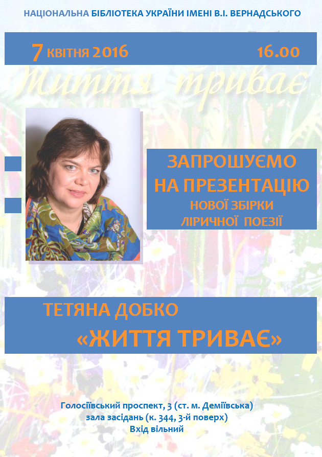 7 квітня 2016 року в Національній бібліотеці України імені В.І.Вернадського відбудеться презентація ліричної збірки, керівника Центру науково-бібліографічної інформації, д-ра наук із соціальних комунікацій, поетеси Тетяни Добко «Життя триває» (Київ: Світ Успіху, 2016).