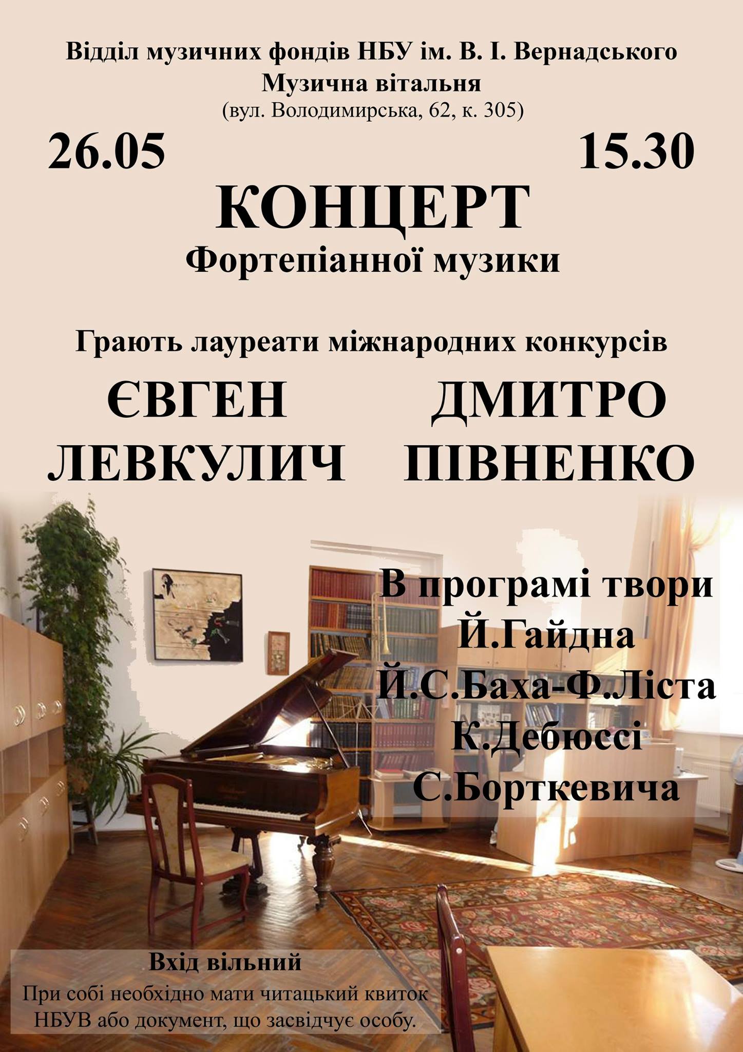 У концерті прозвучать твори Й. Гайдна, Й. С. Баха - Ф. Ліста, К. Дебюссі, С. Борткевича. Початок о 15.30. Вхід вільний. При собі необхідно мати читацький квиток НБУВ або документ, що засвідчує особу.