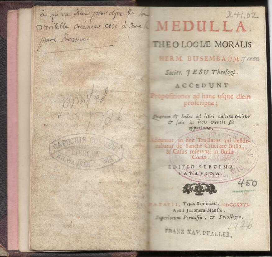 Busenbaum, Hermann. Medulla theologiae moralis Herm. Busembaum. Societ. Jesu theologi. Accedunt Propositiones ad hanc usque diem proscriptae; Quarum et Index ad libri calcem texitur et suis in locis mentio fit opportuna. Adduntur in fine Tractatus qui desiderabatur de Sanctae Cruciatae Bulla, et Casus reservati in Bulla Coenae. – Editio septima patavina. – Patavii [Padova] : Typis Seminarii : Apud Joannem Manfrè, 1726. – [28], 773, [51] p., [1] f. tab. ; 12°.