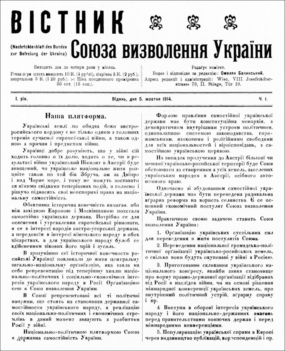 Відкривають експозицію публікації програмних документів і статей Союзу визволення України та Української народної республіки, що друкувалися у віденському «Віснику Союза Визволення України» (з 1918 «Вісник політики, літератури й життя») – «Наша плятформа»,1914; «Др. Льонгін Цегельський. Святочна промова на віденськім концерті в честь Шевченка 6 мая 1916 р.» (1916); «Четвертий Універсал У. Ц. Ради про самостійність України» (1918) та офіційних виданнях уряду УНР – «IV Універсал Української Центральної Ради» (Вістник Ради народних міністрів Української Республіки, 1918), «Грамота до всього українського народу [гетьмана Павла Скоропадського від 29 квітня 1918 р.]» (Державний вісник, 1918).