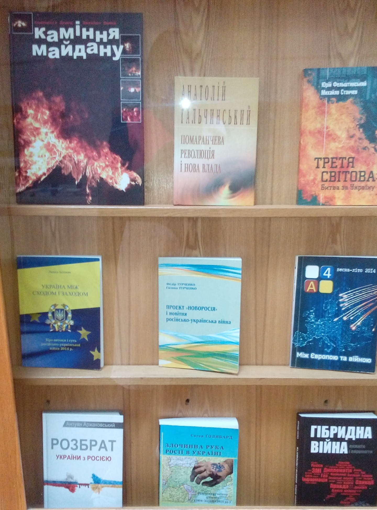 Чільне місце в експозиції посідають видання, що містять аналіз витоків і особливості новітньої російсько-української війни, і які допоможуть читачам зрозуміти глибинне підґрунтя цивілізаційного конфлікту між Європою та Євразією на землях України у 2014 році. Серед них – нові праці вчених Інституту історії НАН України: «Верменич Я. Південна Україна на цивілізаційному пограниччі» (2015), «Турченко Ф., Турченко Г. Проект «Новоросія» і новітня російсько-українська війна» (2015) та ін.