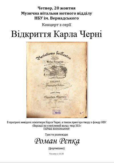 У четвер, 20-го жовтня відбудеться концерт, програма якого складається суто з прем’єр. Слухачі стануть першими свідками виконань забутих шедеврів добре відомого композитора Карла Черні. Творчість автора знаменитих етюдів для піаністів-початківців, на думку Романа Рєпки, ще й досі не оцінена належним чином. Кульмінацією концерта-розповіді стане прем’єра унікально рідкісного видання Карла Черні, що зберігається у фонді НБУ ім. Вернадського – «Варіації, тв. 353». Годі й казати, що цей твір ви не знайдете в записах та у концертних програмах. Після концеру, до уваги присутніх буде представлено виставку з прижиттєвих видань К. Черні, в тому числі й ноти творів виконаних у програмі концерту. Початок о 15.30. Вхід вільний. Чекаємо на прем’єрі!