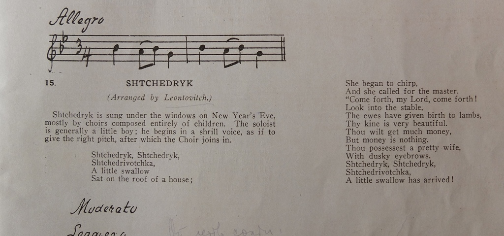 Сьогодні Україна і світ відзначає 100-річний ювілей з нагоди першого концертного виконання одного з найдивовижніших шедеврів української музики – «Щедрика» Миколи Леонтовича. Українська народна мелодія в обробці великого Майстра хорової справи стала Послом миру, віри, надії та любові в усьому світі. Упродовж ста років музикознавці досліджують феномен «Щедрика» (Пилип Козицький, Микола Гордійчук, Лю Пархоменко, Валентина Кузик та інші). Великої уваги щодо розгляду цього питання заслуговують праці В. Кузик, яка в одній із своїх статей виокремлює п’ять напрямків дослідження «Щедрика»: історичний, музичний, вербальний, графічний, нумерологічний [5]. Як же і коли виник цей діамант української музики? Звернемося до спогадів сучасників М. Леонтовича - Болеслава Яворського і Сергія Протопопова та до наукових розвідок дослідників його творчості. Як зазначає В. Кузик : «На рукописі «Щедрика», надісланого Олександрові Кошицю, стоїть дата 18 серпня 1916 р. Я. Юрмас (Юрій Масютин) зазначав, що текст взято зі «Збірничка найкращих українських пісень нотами» 1913 р., ч. ІV, К. Поліщука – М. Остаповича (№ 23, с. 18). Проте, за згадкою Болеслава Яворського поліфонічні вправи з мотивом-ostinato «Щедрик» розпочалися ще 1910 р. Логічно припустити, що М. Леонтович обрав фольклорний зразок, знайомий з дитинства, який побутував на Поділлі (можливо й сам змалку защедрував не одну цукерку). Зі збірки К. Поліщука – М. Остаповича він взяв тільки слова, записані збирачами фольклору на Волині в м. Краснопіль Житомирського повіту» [5]. Займаючись у свого вчителя Б. Яворського, котрий «… збагнув силу небуденного таланту Миколи Дмитровича, його тонке чуття народності і робив усе для того, щоб розвинути в ньому ці якості. Навіть завдання для оволодіння прийомами й засобами класичної поліфонії він нерідко давав йому на основі народно-пісенних мелодій. Саме так виник у першій редакції славнозвісний «Щедрик» (завдання на остінато)» [2, 20]. Як бачимо, зі спогадів С. Протопопова про заняття Б. Яворського з Д. Леонтовичем, саме ostinato мотиву з чотирьох звуків заданої народної мелодії було першим із десяти завдань до «Щедрика» [6, 40]. Композитор цей мотив повторює «…незмінно…з проведенням у всіх партіях 68 разів!» [5]. В наступних пунктах завдання Б. Яворський надає учню приклади прийомів поліфонічного письма, які Леонтович мав використати. Як зазначає В. Кузик : «Композиція вражає тим, що в ній досягнуто наскрізного драматургічного розвитку завдяки, насамперед, поліфонічним принципам мислення» [5]. У десятому пункті завдання Леонтович повинен був надати «вигляду неподільного цілого, а не куплетної форми, якої тоді Микола Дмитрович свято дотримувався, вважаючи всякий замах на куплетну ясність бісівською справою» [6, 40]. Таким чином, саме завдання вчителя підштовхнули композитора до створення унікальної ладової схеми твору (весь твір чути зміну функції тоніки: мерехтіння тоніка-домінанта аж до 25 т. і тільки у 32 т. мерехтіння виростає у повноцінне розв’язання та нової форми народної пісні : ««Щедрик» став вищим досягненням щодо форми» [1, 35]. Вперше, «Щедрик» М. Леонтовича пролунав у виконанні студентського хору Київського університету імені Святого Володимира, яким на той час керував О. Кошиць. Одразу твір здобуває великого успіху і популярності : «Справжнім потрясінням для київської громади ст