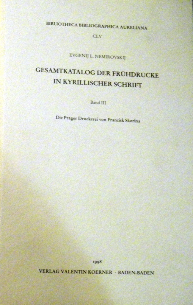 Nemirovskij E. Gesamtkatalog der Frühdrucke in kirillischer Schrift. – Bd. 3. Die Prager Druckerei von Francisk Skorina. – Baden-Baden, 1998. – 405 s. – (Bibliotheca bibliographica Aureliana. 155).