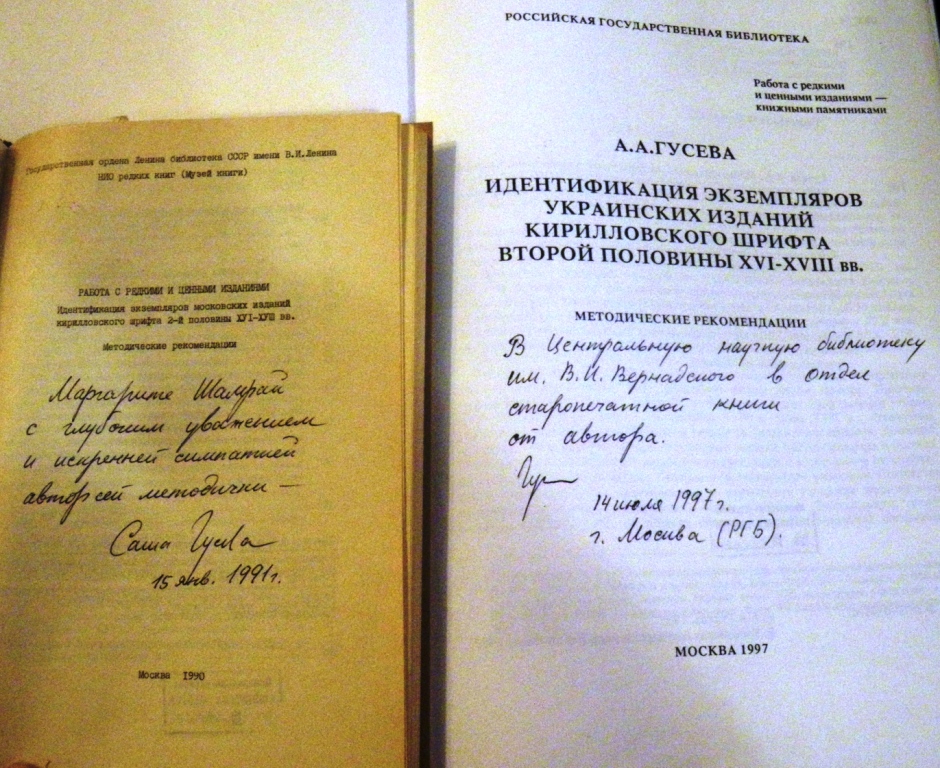 Гусева А.А. Идентификация экземпляров украинских изданий кирилловского шрифта второй половины ХVІ–ХVІІІ вв. : метод. рек. / РГБ, А.А. Гусева. – Москва, 1997. – 139 с. – (Работа с редкими и ценными изданиями (книжными памятниками).