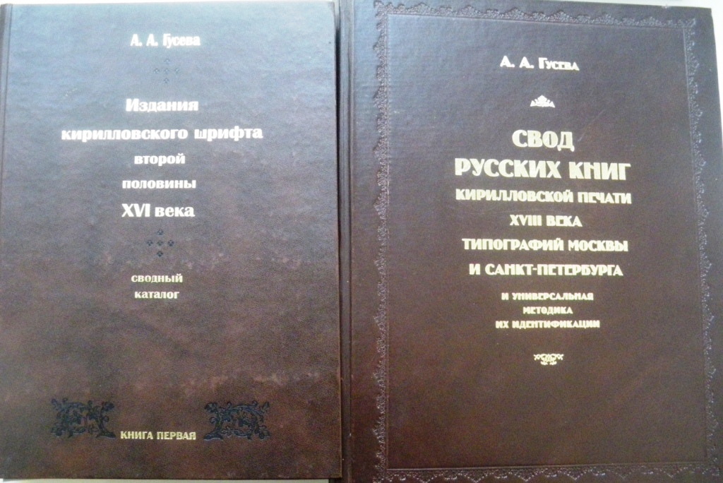 Гусева А.А. Свод русских книг кирилловской печати ХVIІІ века типографий Москвы и Санкт-Петербурга и универсальная методика их идентификации / А.А. Гусева. – Москва : Индрик, 2010. – 1251 с.