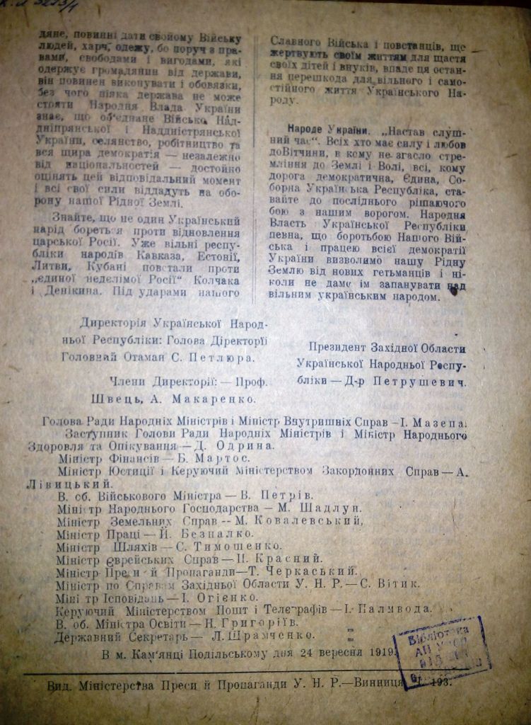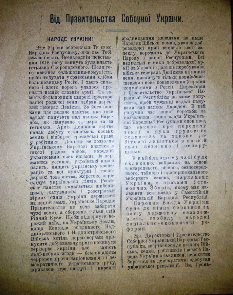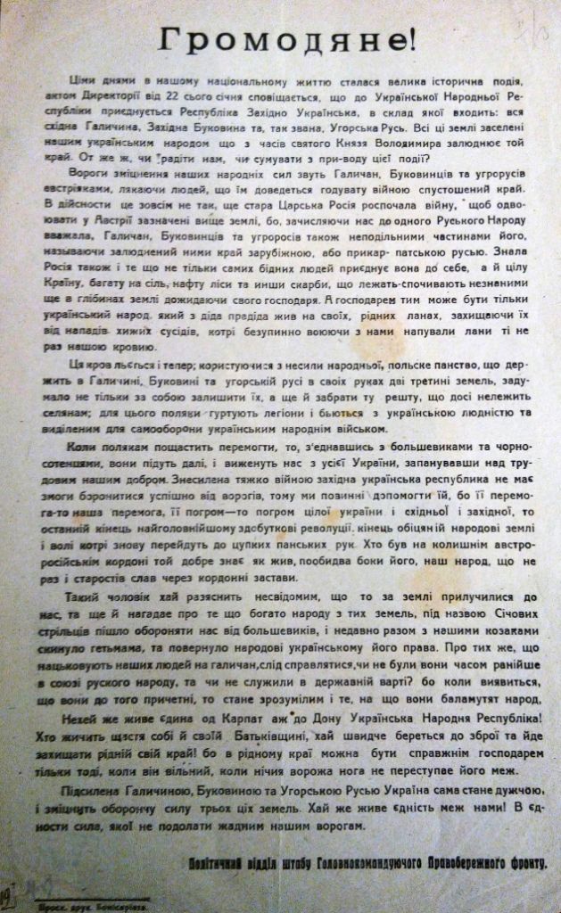 Рік потому – 22 січня 1919 р. – відбулося урочисте злучення Української Народної Республіки та Західноукраїнської Народної Республіки в єдину Українську державу. «Цими днями в нашому національному життю сталася велика історична подія, актом Директорії від 22 сього січня сповіщається, що до Української Народної Республіки приєднується Республіка Західно-Українська», – йдеться у листівці Політичного відділу Головнокомандуючого Правобережного фронту, адресованій громадянам.