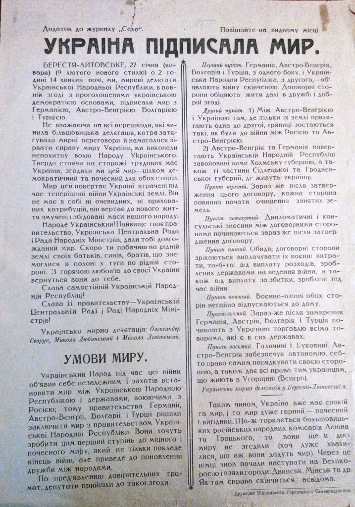 В обороні незалежності України міцніла українська дипломатія. Початок міжнародно-правовому визнанню України як суверенної держави поклав Брестський мирний договір, укладений делегацією Української Центральної Ради 9 лютого (27 січня) 1918 р., про який йдеться в листівці-оповістці під назвою «Україна підписала мир» та інших летючках збірки.