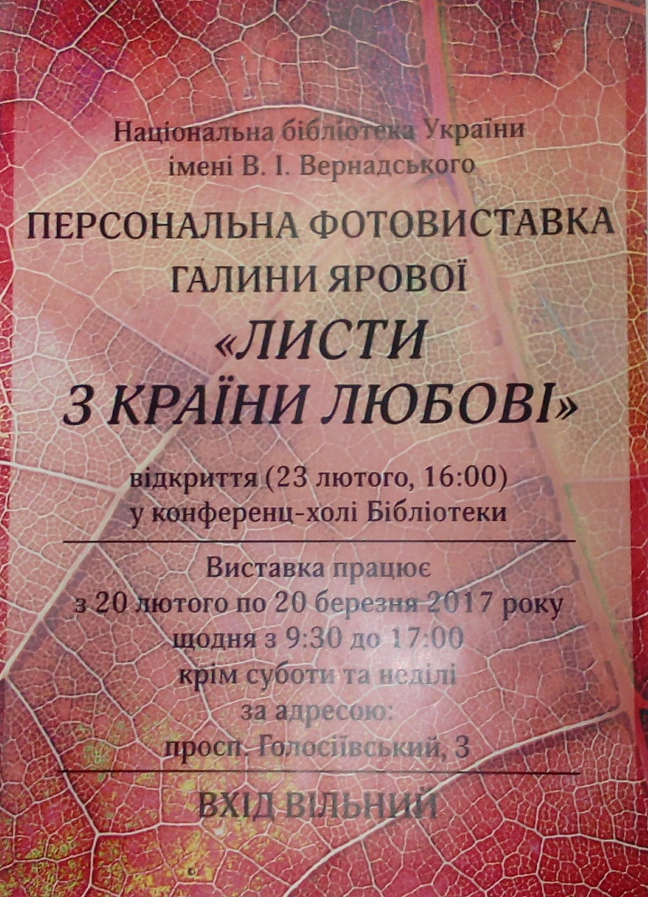 У четвер, 23 лютого у Національній бібліотеці України імені В.І.Вернадського відбудеться відкриття персональної фотовиставки Галини Ярової «Листи з країни Любові».