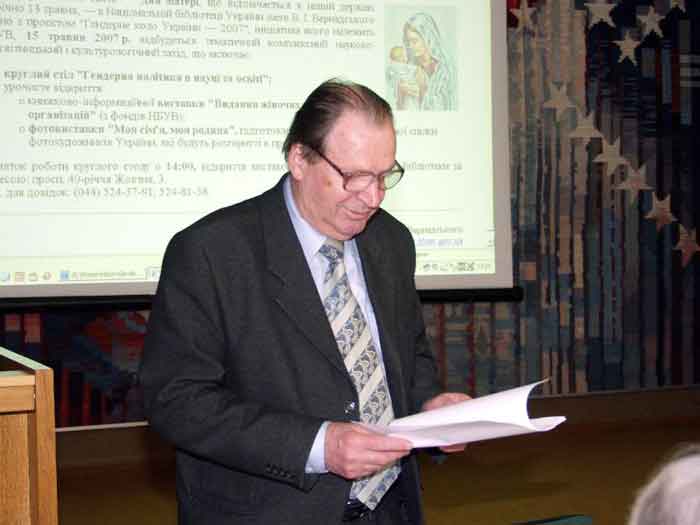 На засідання круглого столу було обговорені такі актуальні проблеми, як гендерна політика в сфері науки (генеральний директор Національної бібліотеки України імені В. І. Вернадського, акад. НАН України О. С. Онищенко); гендерні паритети в умовах трансформації сучасного суспільства (заввідділом теорії держави і права Інституту держави і права ім. В. М. Корецького НАН України, д-р юр. наук, керівник Центру правових досліджень гендерної політики Н. М. Онищенко); гендерна компонента у структурі вищої технічної освіти та природничих наук (проректор з міжнародних зв'язків Національного технічного університету України "Київський політехнічний інститут", чл.-кор. НАН України, директор Українського центру гендерної освіти С. І. Сидоренко, заст. директора з науково-методичної роботи Українського центру гендерної освіти Ю. В. Стребкова); сучасний стан гендерної нерівності в Україні (ст. наук. співроб. відділу соціальних структур Інституту соціології НАН України, канд. філос. наук Н. В. Лавриненко); експерт Програми ООН сприяння гендерній рівності, політико-правові проблеми гендерних перетворень в Україні канд. юр. наук Т. М. Мельник; гендерна рівність на рівні сім'ї (директор Міжнародного гуманітарного центру "Розрада", канд. псих. наук В. М. Бондаровська).