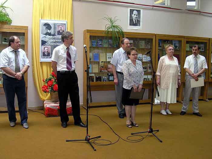 В експозицію, представлену Національною бібліотекою Білорусі, включено матеріали конференцій, збірники, підручники з історії білоруської літератури; широко відбито спадщину Янки Купали та Якуба Колоса. Це, зокрема: зібрання творів, вибрані твори, сонети в оригіналі і в перекладі різними мовами світу; словник Янки Купали у 8-ми томах; твори про життя та діяльність видатних поетів і діячів слов'янської культури; перша в Білорусі персональна енциклопедія "Янка Купала"; копії обкладинок та титульних аркушів прижиттєвих видань з автографами авторів.