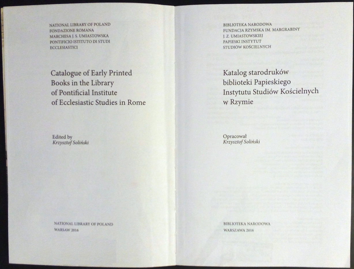 Фонд книгознавчої та бібліографічної літератури відділу стародруків та рідкісних видань Інституту книгознавства поповнився новим виданням під назвою «Katalog starodruków biblioteki Papieskiego Instytutu Studiów Kościelnych w Rzymie» (Варшава, 2016), укладач К. Солінський.