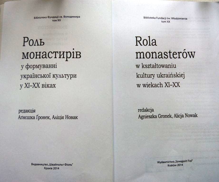 Rola monasterów w kształtowaniu kultury ukraińskiej w wiekach XI–XX = Роль монастирів у формуванні культури у XI–XХ віках / red. Agnieszka Gronek, Alicja Nowak. – Kraków : Szwajpolt Fiol, 2014. – 375 s. : il. – (Biblioteka Fundacji św. Włodzimierza ; т. XX).