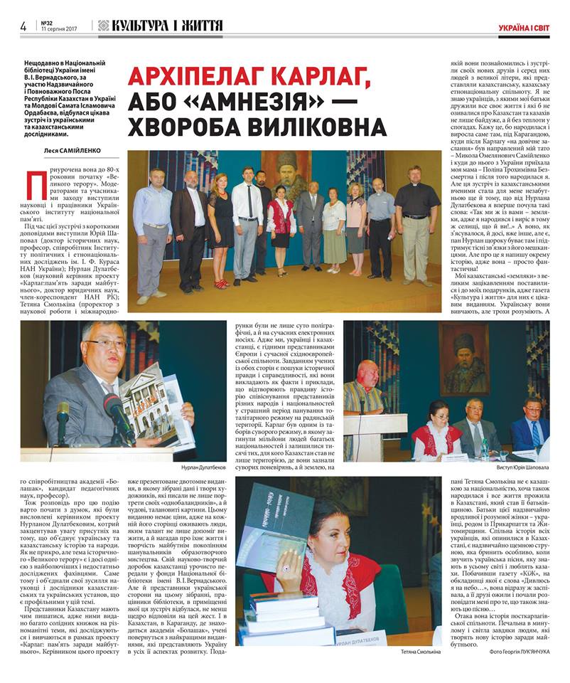 Відгук журналістки тижневика «Культура і життя» Лесі Самійленко про зустріч істориків «Пам'ять про тоталітаризм: український та казахстанський досвід» (НБУВ, 25.07.2017), організованої Українським інститутом національної пам’яті на відзначення 80-х рокових «Великого терору».