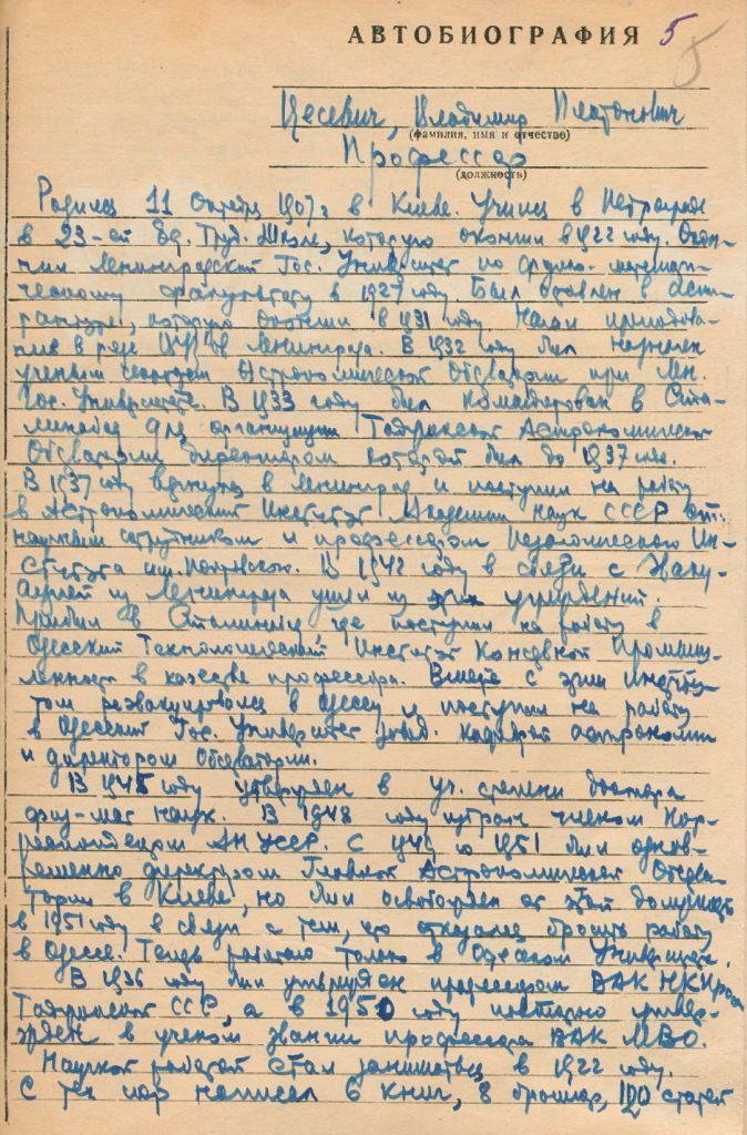 В. П. Цесевич (1907, Київ – 1983, Одеса) – викладач (1930–1933), вчений секретар (1932–1933) Астрономічної обсерваторії Ленінградського державного університету, директор Таджицької астрономічної обсерваторії (1934–1937) в м. Душанбе, старший науковий співробітник Астрономічного інституту АН СРСР (1937–1942), професор (з 1937), декан фізико-математичного факультету (1939–1941) Ленінградського педагогічного інституту. від 1942 р. до 1944 р. – професор, заступник директора, декан технологічного факультету, завідувач кафедри вищої математики і фізики Одеського технологічного інституту консервної промисловості. Професор, завідувач кафедри астрономії, директор астрономічної обсерваторії Одеського державного університету (1944–1983).