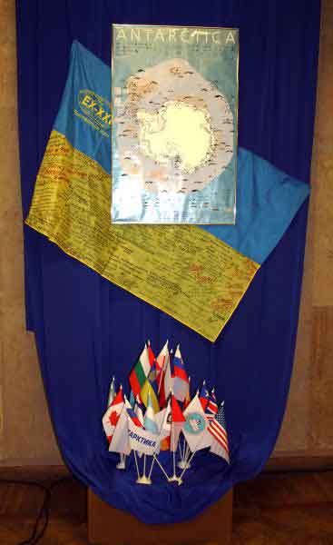 9 серпня 1992 р. Україна ратифікувала Антарктичний Договір, а з 6 лютого 1996 р. здійснює дослідження Антарктики на власній науковій станції "Академік Вернадський", що була передана Україні Великобританією. За цей час на станції побували сотні українських дослідників, які представляють провідні академічні інститути та вищі навчальні заклади країни. Наші вчені несуть цілорічну вахту на острові Галіндез архіпелагу Аргентинські острови, а влітку здійснюють сезонні експедиції в рамках Державної цільової програми досліджень України в Антарктиці 2002-2010 рр. Науковці та персонал станції, виконуючи свої завдання за тисячі кілометрів від рідної домівки, гідно дотримуються всіх пунктів згаданого Договору, зміцнюючи міжнародну співпрацю та імідж сучасної європейської держави. Нині Україна — повноважний член СКАР (Наукового комітету з антарктичних досліджень),консультативний член АТСМ (постійно діючої Консультативної Наради країн, які підписали Договору про Антарктику), а його ХХХІ, двотижневе, засідання торік було успішно проведене в Києві. Керівників делегацій 46 країн світу приймав у себе Президент України Віктор Ющенко.