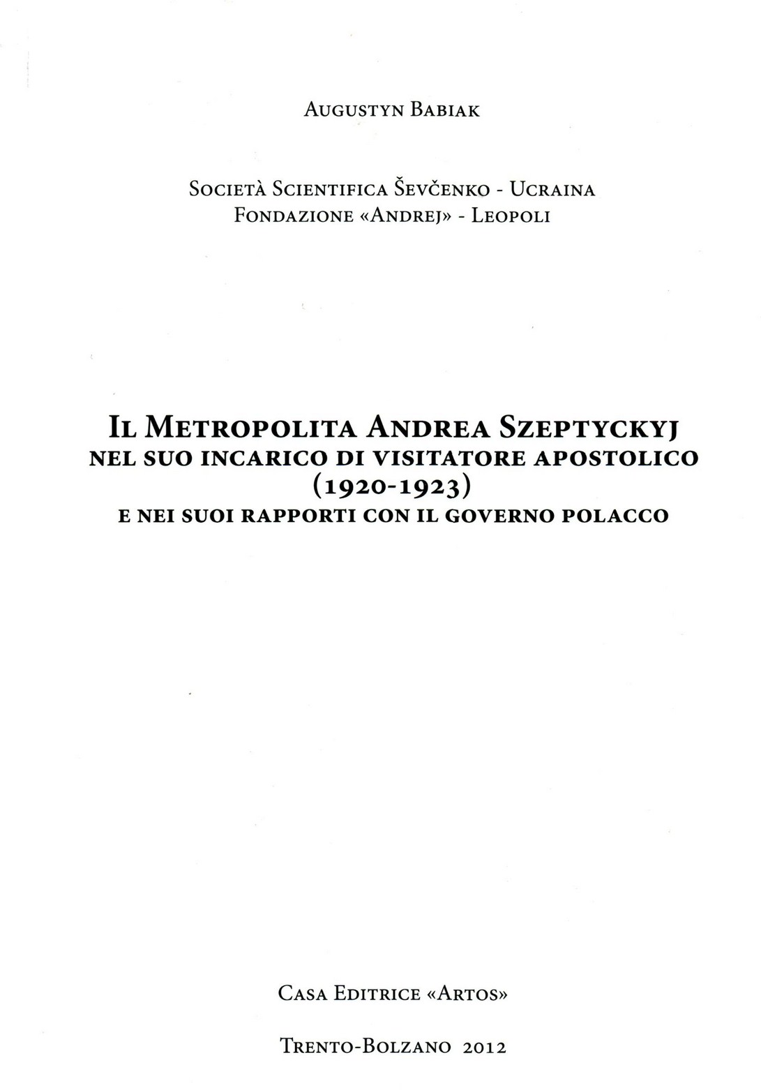 Babiak, Augustyn. Il Metropolita Andrea Szeptyckyj nel suo incarico di visitatore apostolico ( 1920 -1923) e nei suoi rapporti con il Governo Polacco [Текст] / Augustyn Babiak; Soc. scientifica Ševčenko - Ucraina, Fond. "Andrej" - Leopoli. - Trento ; Bolzano: Casa editrice "Artos", 2012. - 253 p.: fot., c.