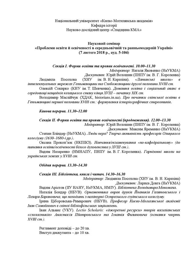 7 лютого 2018 р. в Національному університеті «Києво-Могилянська академія» відбувся Всеукраїнський науковий семінар «Проблеми освіти і освіченості в середньовічній та ранньомодерній Україні», організований кафедрою історії та науково-дослідним центром «Спадщина КМА». Захід проводився в рамках Днів науки НаУКМА – 2018. До участі в семінарі долучилися науковці з Києва, Харкова, Полтави та Львова, що представляли окрім Могилянки Харківський національний університет ім. В.Каразіна, Київський національний університет ім. Т.Шевченка, Полтавський національний педагогічний університет ім. В.Г.Короленка, Український католицький університет, Інститут історії України НАНУ, Національну бібліотеку України ім. В.І.Вернадського та Києво-Печерський історико-культурний заповідник.