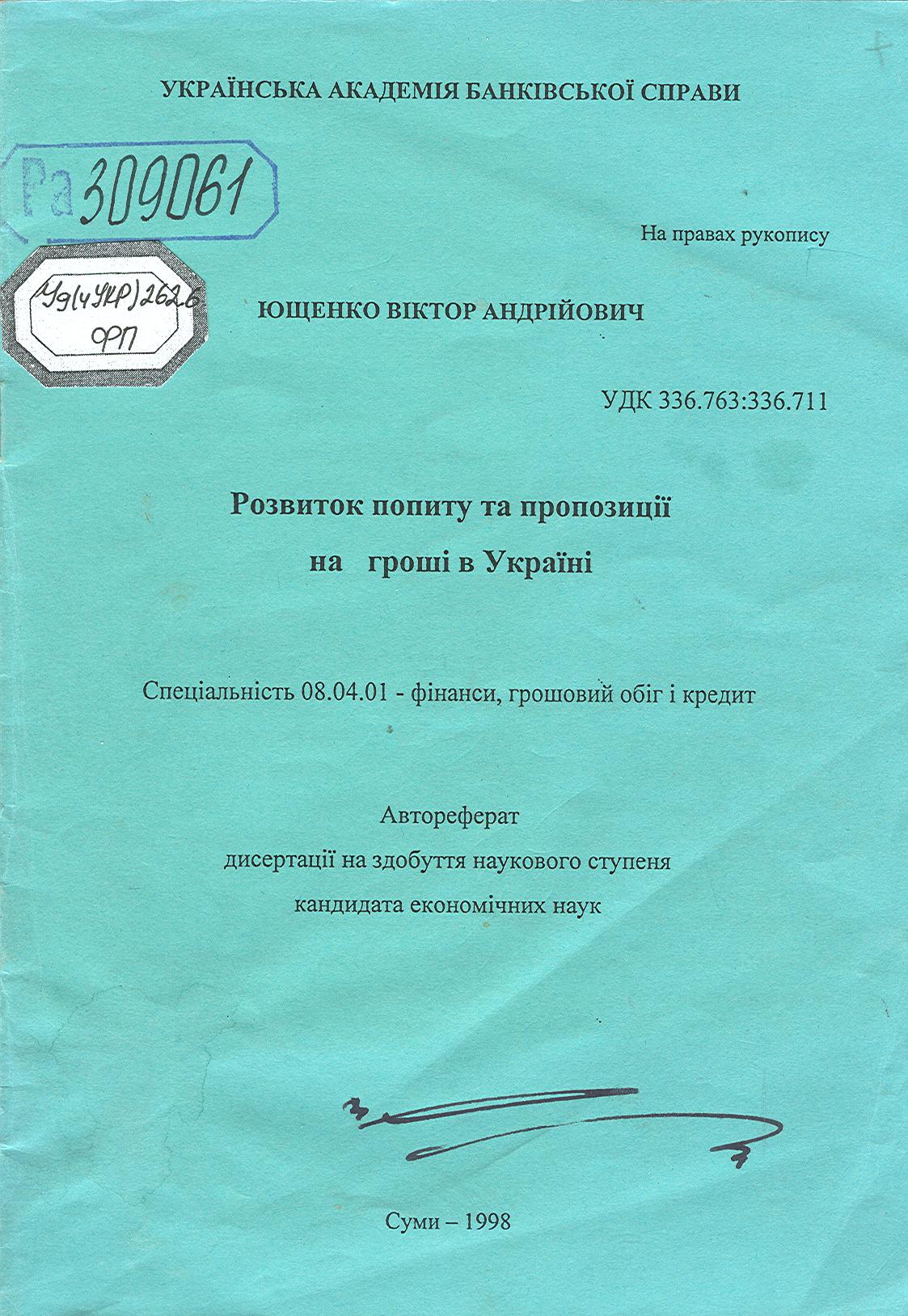 8. Ющенко, Віктор Андрійович. Розвиток попиту та пропозиції на гроші в Україні [Текст] : автореф. дис... канд. екон. наук: 08.04.01 / Ющенко Віктор Андрійович ; Українська академія банківської справи. - Суми, 1998. - 17 с.