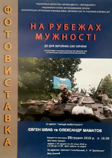 20 грудня 2018 року у холі конференц-залу Національної бібліотеки України імені В.І. Вернадського відкрилась фотовиставка «На рубежах мужності». Її організатори – Національна бібліотека України імені В.І. Вернадського, Національна спілка фотохудожників України та Всеукраїнська організація інвалідів війни, збройних сил та учасників бойових дій. Виставку ініціатори присвятили не тільки Дню Збройних Сил України, а й учасникам Операції об’єднаних сил та українським військовополоненим морякам, підтримуючи їх у такий спосіб.