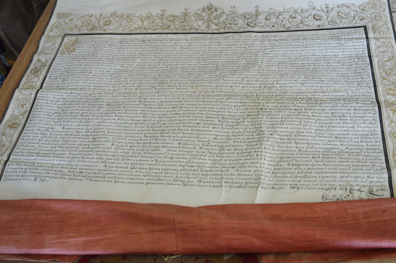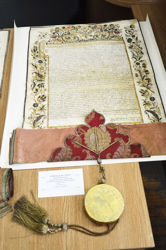 Історія вимушених мандрів Грамоти Петра І з цих стін до Німеччини й назад заслуговує окремої докладної розмови, що й буде зроблено пізніше. А на тепер слід відзначити, що цей документ має велику історичну цінність. Грамота була вивезена в роки Другої світової війни з колекції рукописного відділу Бібліотеки Академії наук України (нині Національна бібліотека України імені В.І. Вернадського), зокрема із зібрання документів Софійського монастиря, у складі котрого зберігалися документи Київської митрополії та колекції Софійської митрополичої ризниці. Цей факт встановлений завдяки дослідженням групи німецьких та українських експертів.
