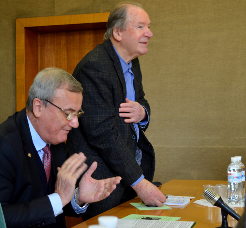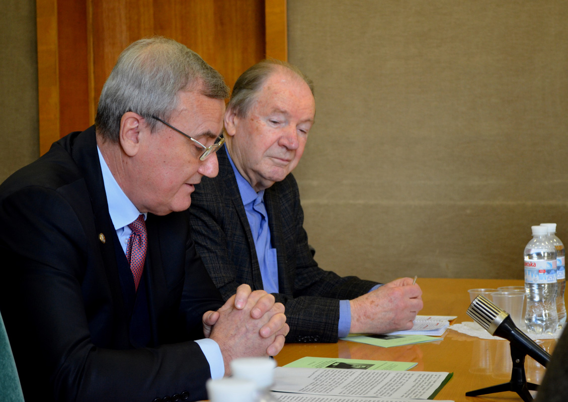 Приємним початком заходу стало сердечне привітання академіка НАН України, почесного генерального директора Національної бібліотеки України імені В.І. Вернадського Олексія Семеновича Онищенка з нагородженням його Золотою медаллю академіка В.І. Вернадського «За видатні досягнення в галузі дослідження і популяризації національної наукової спадщини». Адже якраз спадщина академіка Володимира Івановича Вернадського є дуже значною частиною наукового й творчого доробку Олексія Семеновича, за що йому висловили щиру вдячність і Президія НАН України, і Комісія з наукової спадщини академіка В.І. Вернадського.
