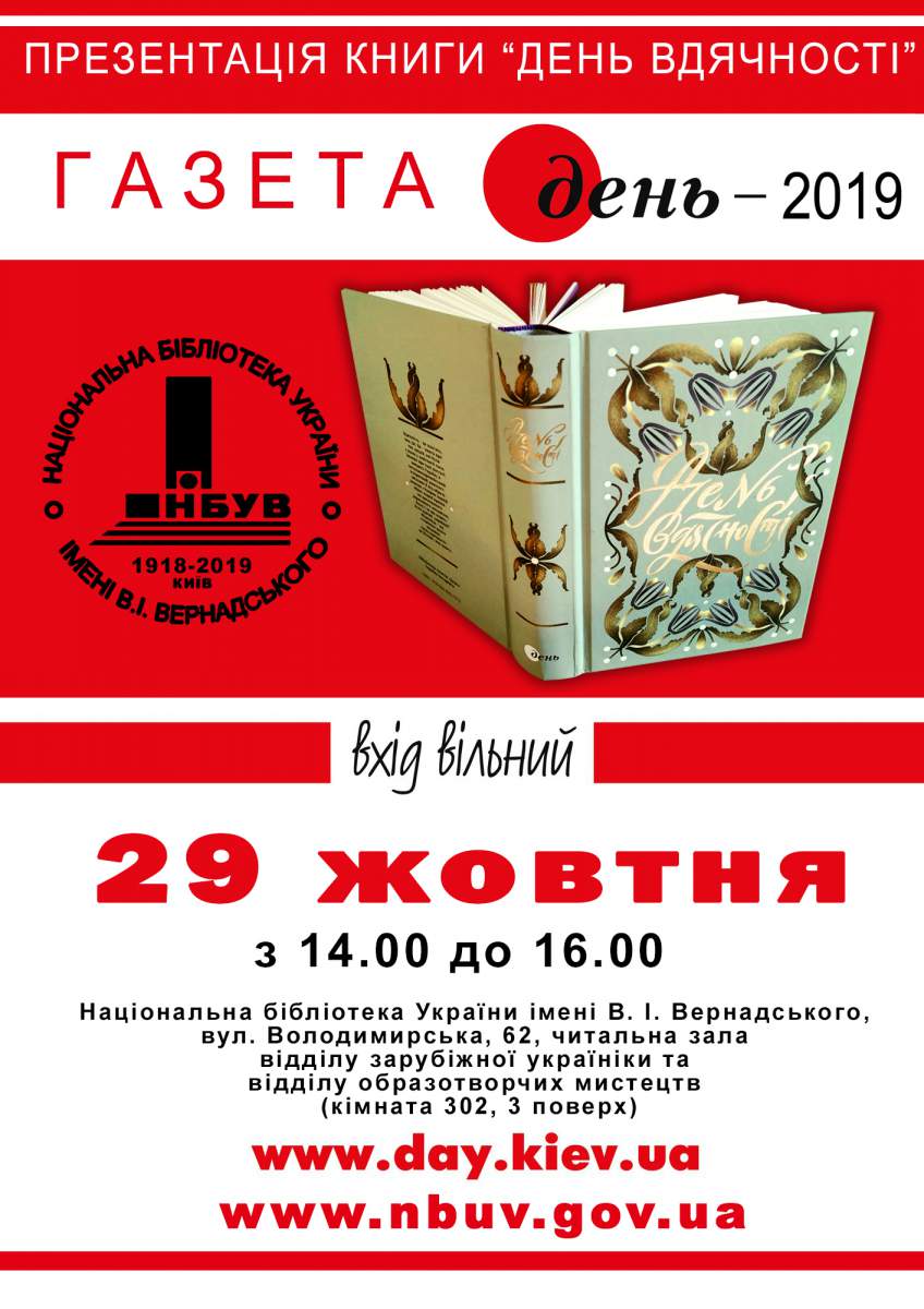29 жовтня 2019 року о 14 годині у відділі зарубіжної україніки Інституту книгознавства відбудеться презентація книги «День вдячності». Її основу складають статті за різні роки на українознавчу тематику у газеті «День». Авторами публікацій є науковці, громадські активісти, журналісти. Упорядники видання – Ігор Сюндюков, співробітник секретаріату Президії НАН України, редактор відділу «Історія і Я» газети «День», та Марія Чадюк, журналістка газети «День», редактор збірника – головний редактор газети «День» Лариса Івшина.