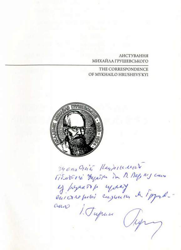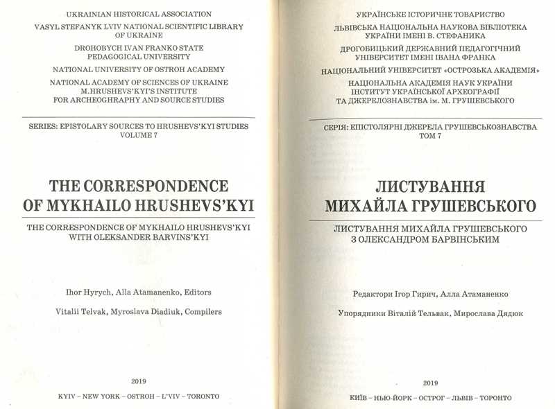 Листування Михайла Грушевського / ред.: І. Гирич, А. Атаманенко ; упоряд.: В. Тельвак, М. Дядюк ; Укр. іст. т-во, Львів. нац. наук. б-ка України ім. В. Стефаника, Дрогобиц. держ. ун-т ім. Івана Франка [та ін.]. – Київ ; Нью-Йорк ; Острог ; Львів ; Торонто, 2019. – 204 с. – (Серія : Епістолярні джерела грушевськознавства ; т. 7 : Листування Михайла Грушевського з Олександром Барвінським). – Парал. тит. арк. англ.