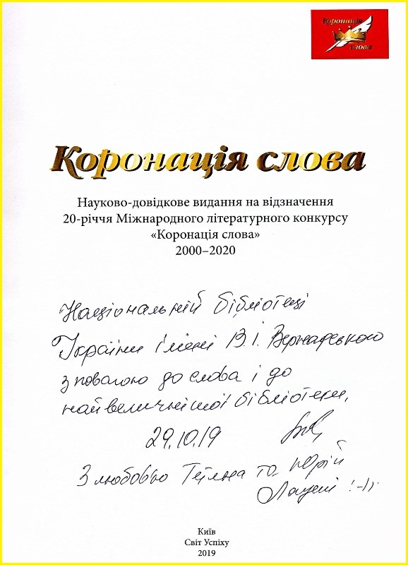 Відома українська благодійниця та громадська діячка, голова правління благодійного фонду «Мистецька скарбниця» Тетяна Іванівна Логуш і Юрій Омелянович Логуш, відомий науковець-економіст, громадський діяч, професор, доктор економічних наук (NYU), подарували до фондів НБУВ унікальне науково-довідкове видання, присвячене 20-річчю Міжнародного літературного конкурсу «Коронація слова». Подружжя Тетяна і Юрій Логуші – співзасновники соціальних проектів: «Коронація слова», «Карнавалія», «Золоті письменники України». Книга підготовлена і видана видавництвом «Світ Успіху» за грантовою програмою Українського культурного фонду «Знакові події для української культури» у тісній співпраці з командою «Коронації слова». Коронація слова : наук.-довід. вид. на відзначення 20-річчя Міжнар. літ. конкурсу «Коронація слова». 2000–2020 / керівник проекту Н. О. Струк ; [редкол.: О. Є. Бондарева, А. В. Будник, Т. І. Вірченко та ін.]. – Київ : Світ Успіху, 2019. – 496 с. : іл. Видання підготовлено на відзначення 20-річчя Міжнародного літературного конкурсу «Коронація слова». Книга вперше комплексно відображає історію конкурсу, подає інформацію про номінації – романів, кіносценаріїв, п’єc, пісенної лірики та творів для дітей і щорічні відзнаки. Представлено біографічні довідки про лауреатів I–III премій, перелік їхніх творів, цитати з інтерв’ю, подано відомості про дипломантів конкурсу, склад журі. Включено також наукові оглядові літературознавчі розвідки, рецензії на відзначені твори. Книга щедро ілюстрована. Видання висвітлює результати багаторічної подвижницької праці засновників і меценатів конкурсу Юрія і Тетяни Логушів та команди проекту. Читачі і співробітники Бібліотеки щиро дякують Тетяні і Юрію Логушам за натхненну працю на ниві української культури, ґрунтовне довідкове видання, яке є своєрідним літописом українського літературного життя XXI століття.