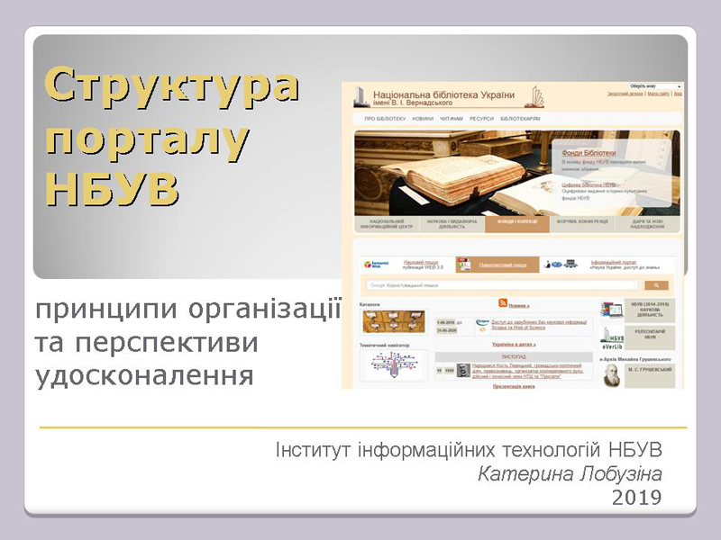 З доповіддю «Структура порталу НБУВ: принципи організації та перспективи удосконалення» виступила директор Інституту інформаційних технологій Катерина Вілентіївна Лобузіна. Вона відзначила, що портал НБУВ та його сайти – це складні веб-інструменти, які мають підтримуватися відповідними спеціалістами. Аналіз півсотні документів з підтримки сайтів різних наукових установ та навчальних закладів засвідчив необхідність виокремленої групи спеціалістів для такої роботи. Наразі в Інституті інформаційних технологій створена група фахівців з підтримки матеріалів офіційного сайту НБУВ, розробляються відповідні документи для оптимізації її роботи.