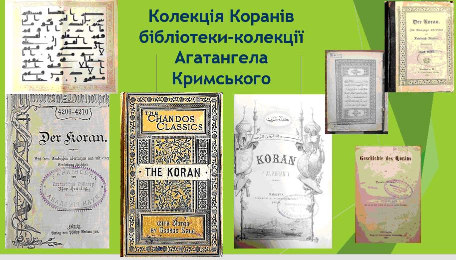 У колекції видатного вченого зібрано 25 різнопланових Коранів. Тексти Святої книги різняться мовними (оригінальні Корани арабською, переклади німецькою, англійською, французькою, польською мовами) і видавничими нюансами, розмірами й мистецьким оздобленням. Та всі ці книги об’єднує один фактор – Агатангел Кримський детально вивчав кожну з них, про що свідчить велика кількість маргіналій і нотаток на сторінках, активно використовував їх у своїх наукових пошуках і теоретичних узагальненнях.