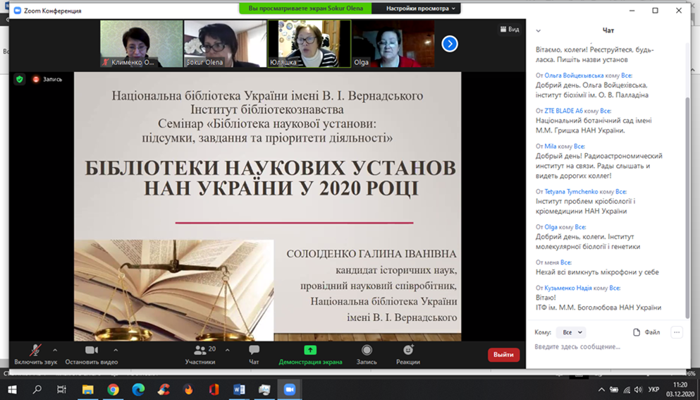 3 грудня 2020 року відбувся традиційний щорічний семінар для працівників бібліотек наукових установ Національної академії наук України «Бібліотека наукової установи: підсумки, завдання та пріоритети діяльності» у форматі онлайнової зустрічі на платформі Zoom (модератор ‒ старший науковий співробітник Інституту бібліотекознавства НБУВ, кандидат наук із соціальних комунікацій О. Л. Сокур). У роботі заходу, який провела виконавчий секретар Інформаційно-бібліотечної ради НАН України, провідний науковий співробітник Інституту бібліотекознавства НБУВ, кандидат історичних наук, старший науковий співробітник Г. І. Солоіденко, взяли участь більше 30 учасників, зокрема – представники Національної бібліотеки України імені В. І. Вернадського, Львівської національної наукової бібліотеки України імені В. Стефаника, бібліотек Інституту електрозварювання ім. Є. О. Патона НАН України, Фізико-механічного інституту ім. Г. В. Карпенка НАН України, Інституту надтвердих матеріалів ім. В. М. Бакуля НАН України, Інституту кібернетики ім. В. М. Глушкова НАН України, Міжнародного науково-навчального центру інформаційних технологій та систем НАН України, Інституту теоретичної фізики ім. М. М. Боголюбова НАН України, Головної астрономічної обсерваторії НАН України, Радіоастрономічного інституту НАН України, Інституту біохімії ім. О. В. Палладіна НАН України, Інституту мікробіології і вірусології ім. Д. К. Заболотного НАН України, Інституту молекулярної біології і генетики НАН України, Інституту проблем кріобіології і кріомедицини НАН України, Інституту електродинаміки НАН України, Інституту клітинної біології та генетичної інженерії НАН України, Національного ботанічного саду ім. М. М. Гришка НАН України, Інституту археології НАН України.