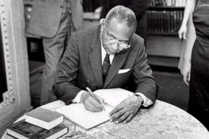 28 травня 1982 року. Генеральний директор ЮНЕСКО Амаду-Махтар М’Боу робить запис у Книзі почесних гостей Центральної наукової бібліотеки АН УРСР (тепер Національна бібліотека України імені В. І. Вернадського).