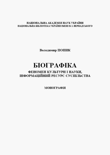 Опубліковано монографію директора Інституту біографічних досліджень, члена-кореспондента НАН України В. І. Попика «Біографіка : феномен культури і науки, інформаційний ресурс суспільства».