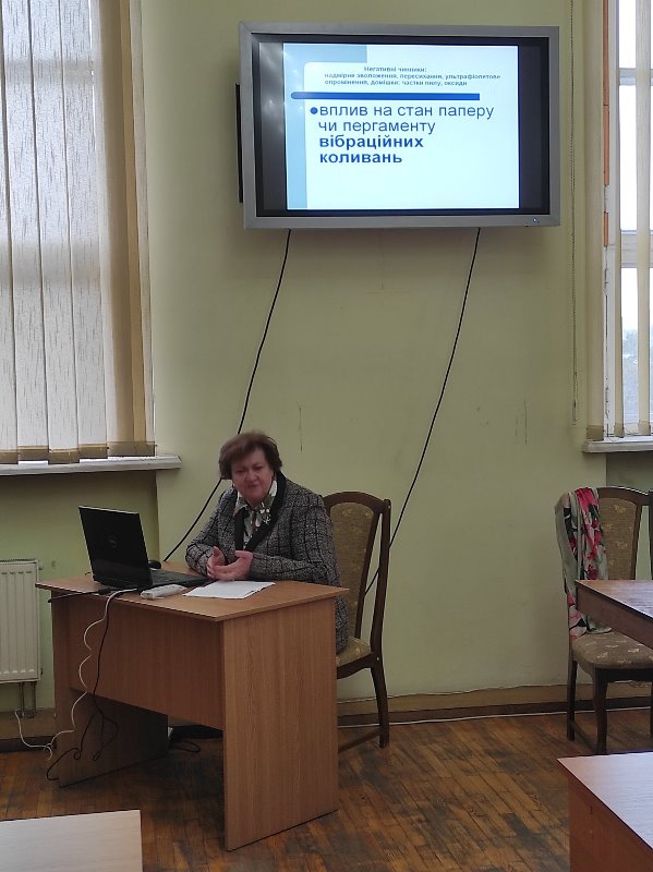 Відкриваючи роботу семінару, виконуюча обов’язки завідувача відділу наукових технологій збереження фондів Л.П. Затока окреслила практичні проблеми та перспективи забезпечення збереження бібліотечних фондів на різних матеріальних носіях у складних сучасних умовах, як то – карантинів, воєнного стану. Мова йшла про особливості впливу навколишнього середовища на матеріальну основу документів, про основні фізико-хімічні та структурні фактори впливу на довговічність цінних документів бібліотек. Л.П. Затока оприлюднила ще одну доповідь матеріалознавчого спрямування – про сучасні методи вимірювання показників якості паперу, підготовлену у співавторстві з науковим співробітником НБУВ, кандидатом технічних наук А.А. Остапенко.