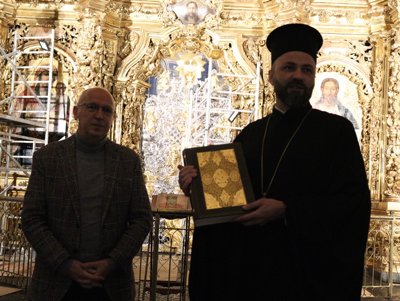 Але спочатку учасники вечора культурної дипломатії пройшли можливими місцями перебування Сковороди саме в Софії Київській, зокрема в Софійському соборі. Тут же Ігор Осташ вручив примірник нового факсимільного видання арабського Мазепинського Євангелія екзарху Вселенського патріархату в Україні владиці Михаїлу. Нагадаємо, що виготовлене воно минулого року з київського примірника цього Євангелія, віднайденого в Національній бібліотеці України імені В.І. Вернадського.