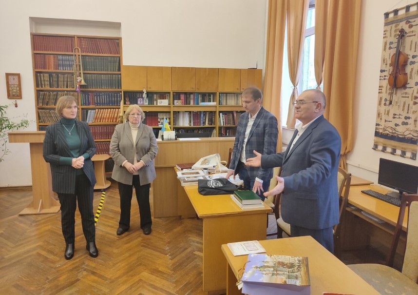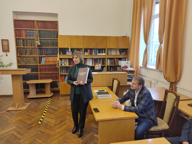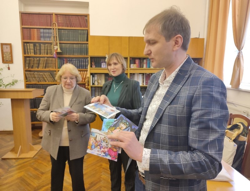 Начальник управління культурної політики і ресурсів Старокостянтинівської міської ради Олександр Афанасьєв подякував колективу НБУВ за теплу атмосферу й душевний прийом. Він звернув увагу на те, що їхнє місто має надзвичайно багату історію. І місцева влада робить усе можливе, щоб на нашій українській території підтримувались саме українські цінності, різноманітний власний продукт. Наприклад, 26 грудня у Старокостянтинові нагородили переможців щорічного конкурсу дитячих малюнків «Зимова листівка княжого міста 2022» - «Тобі, мій Воїне…». Усі малюнки стали відображенням нашого часу – складного, багатогранного, воєнного. У кожному присутня українська душа, яка боронить землю, дбає про неї, вірить у Перемогу. Малюнки, які здобули перші місця, були відтиражовані як унікальні вітальні іміджеві листівки. Підписані дітьми Старокостянтинівської міської територіальної громади листівки будуть передані через волонтерів захисникам України.