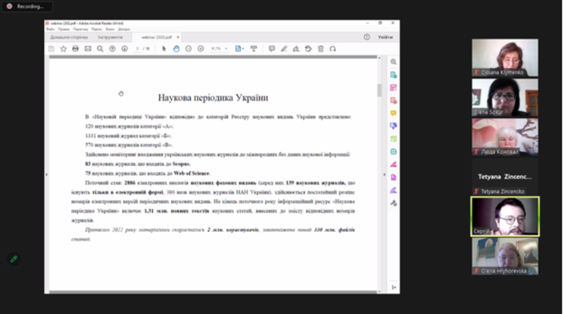 23 лютого 2023 р. відбувся тематичний науково-методичний семінар для бібліотекарів «Українська наука на шляху до Європейського та світового інформаційного простору», організований відділом науково-методичної роботи Інституту бібліотекознавства Національної бібліотеки України імені В. І. Вернадського. Захід пройшов у форматі онлайнової зустрічі на платформі Zoom (модератор ‒ завідувачка відділу науково-методичної роботи Інституту бібліотекознавства НБУВ, кандидатка наук із соціальних комунікацій О. Л. Сокур).