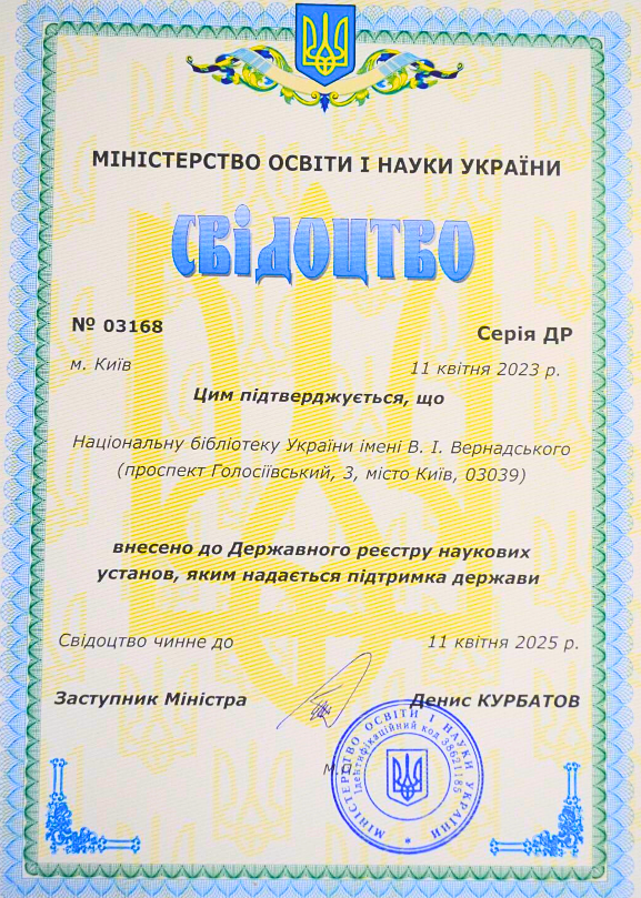 Нещодавно ми отримали документ Міністерства освіти і науки України – свідоцтво про те, що Національну бібліотеку України імені В.І. Вернадського внесено до Державного реєстру наукових установ, яким надається підтримка держави.