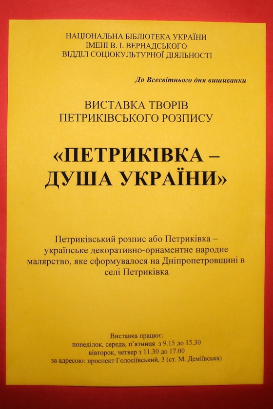 А напередодні в стінах бібліотеки відкрилась виставка творів унікального явища світового масштабу – петриківського розпису: «Петриківка – душа України». Петриківський розпис – це українське декоративно-орнаментальне народне малярство, яке сформувалось на Дніпропетровщині в селищі Петриківка й налічує вже понад століття. Він внесений до Репрезентативного списку нематеріальної культурної спадщини людства ЮНЕСКО.